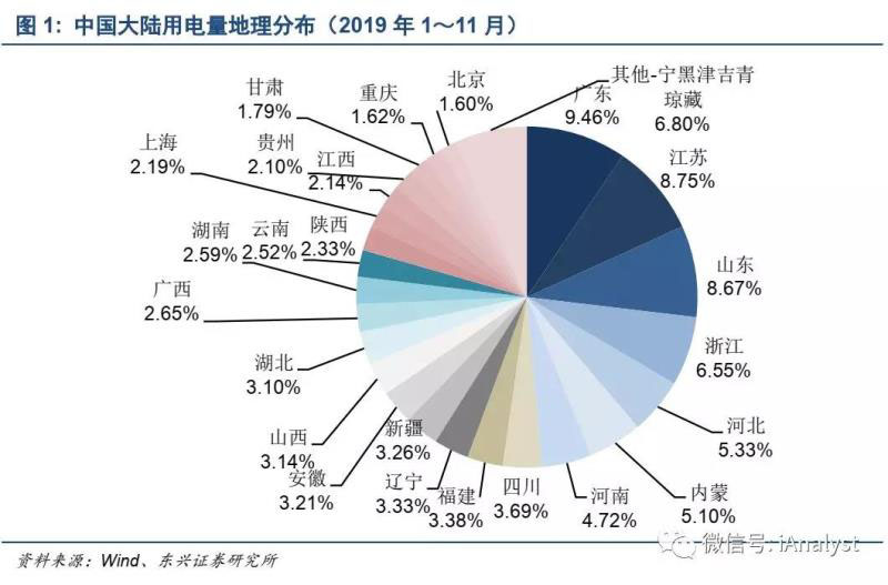 我國是人口大國,且電力資源以自給自足為主。據(jù)能源局發(fā)布的統(tǒng)計數(shù)據(jù),2019年中國大陸全社會用電量達(dá)到7.2255萬億kWh,我們測算,較2011年的年均復(fù)合增速為5.52%。從2019年前11個月各省區(qū)(含直轄市)用電量數(shù)據(jù)來看,21個省區(qū)的用電量占比各自超過2%,14個省區(qū)的用電量占比各自超過3%;其中,廣東、江蘇、山東、浙江的用電量居前,皆超過6%,合計占比33.4%,如圖1所示。
