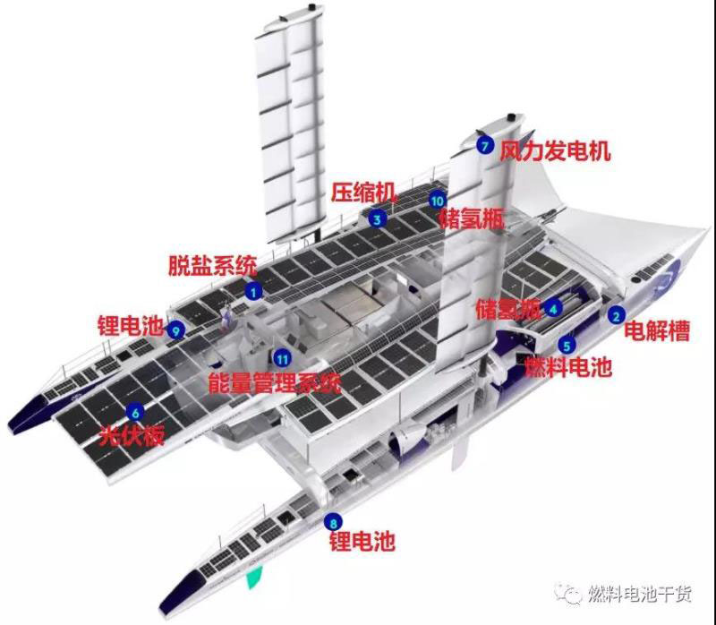 Energy Observer雙體船主要提供三種動(dòng)力模式:1)正常航行中,由太陽(yáng)能或風(fēng)能直接為推進(jìn)提供動(dòng)力;2)發(fā)電量暫時(shí)下降期間,鋰電池組將接管,為推進(jìn)提供動(dòng)力;3)長(zhǎng)時(shí)間停船期,燃料電池將接管,消耗氫氣發(fā)電和儲(chǔ)電。