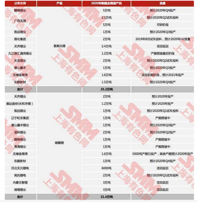據(jù)SMM統(tǒng)計(jì),2019年中國(guó)碳酸鋰產(chǎn)量為15.9萬(wàn)噸,中國(guó)氫氧化鋰產(chǎn)量為7.6萬(wàn)噸。隨著年初國(guó)內(nèi)新能源汽車市場(chǎng)釋放相關(guān)利好政策,以及特斯拉國(guó)產(chǎn)化進(jìn)程的加快,2020年國(guó)內(nèi)上游鋰鹽廠新建產(chǎn)能數(shù)量以及進(jìn)度情況,尤其是國(guó)內(nèi)氫氧化鋰產(chǎn)能的建設(shè)情況受到全行業(yè)關(guān)注。對(duì)此我們總結(jié)如下: