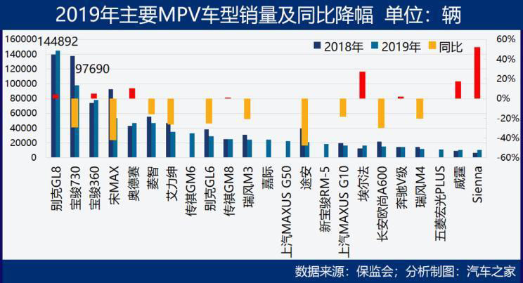 2019年,商用的合資品牌高端車型、進(jìn)口車型銷量大幅上漲,比如埃爾法增長27%,國產(chǎn)奔馳V級(jí)增長1.9%、進(jìn)口奔馳V級(jí)增長181%,威霆增長17.16%,Sienna增長52%,年銷量接近15萬輛的別克GL8增長3.9%……與之形成對比的是,寶駿730減少了29%,宋MAX減少42%,菱智減少15.7%,瑞風(fēng)M3減少21%……