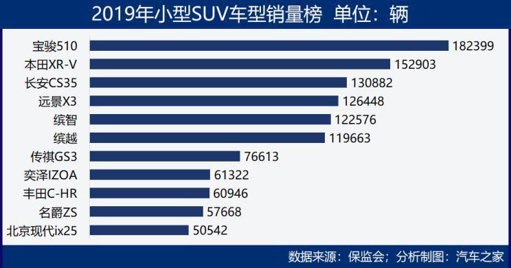比如,本田XR-V車型2019年在一級(jí)城市的銷量上漲了2.3%,在年度車型榜上依然排在第二位,冠軍車型寶駿510的年銷量下滑了41%,長安CS35則同比上漲23%。吉利汽車在2018年底推出的新車型繽越全年銷售12萬輛,排在廣汽本田的繽智之后。年度銷量超過5萬輛的車型中,日系上榜4款,另有北京現(xiàn)代ix25也進(jìn)榜,2018年8月上市的另一款韓系小型SUV在2019年銷售了3.9萬輛。小型SUV市場上也出現(xiàn)了豪華品牌的身影,奧迪Q2L,2018年底上市,2019年實(shí)現(xiàn)銷量3.8萬輛。