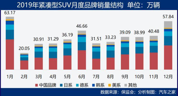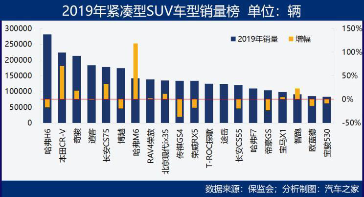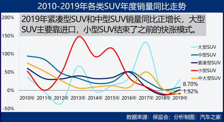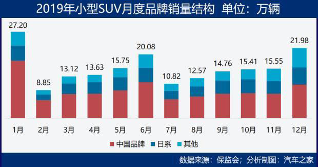 但是,德系全年走出43%的增幅,日系也增長了11%,同期中國品牌SUV卻大幅下降了17%,而且令人憂心的是,中國品牌在各級(jí)SUV板塊市場上全線失速,有優(yōu)勢的小型SUV和緊湊型SUV板塊降幅分別為23.5%和15.5%。2019年,中國品牌SUV可謂承壓巨大。