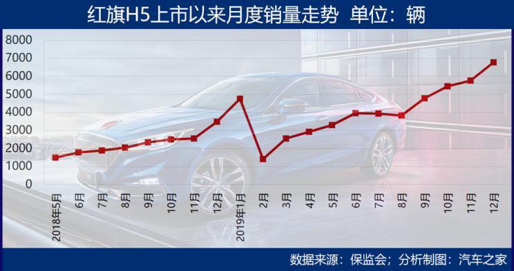 盡管上升不易,但2019年算是中國品牌中型乃至中大型轎車的發(fā)力之年,以紅旗品牌系列車型進(jìn)軍高端市場為代表。紅旗H5于2018年5月上市,上市以來累計(jì)銷量67542輛,2019年走出了一路向上的銷售曲線,12月單月實(shí)現(xiàn)銷量6773輛,排在當(dāng)月中型轎車銷量第12位。