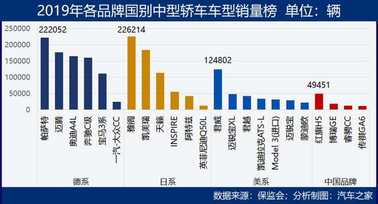 中型轎車在轎車市場的占比有21%,2019年累計(jì)銷量226萬輛,德系一家獨(dú)大,以93萬輛的年銷量占到41%的份額,同比增長3.3%;日系年銷量66萬輛,同比增長5.2%,市場份額29%,中國品牌僅占4.6%,較2018年下滑0.6個(gè)百分點(diǎn),全年銷售10.4萬輛,同比減少13.5%。