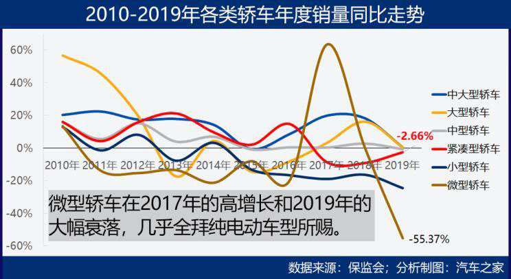 品牌割據(jù)方面,以5.59%的年度同比降幅為基準(zhǔn),2019年德系和日系轎車銷量跑贏整體板塊市場,尤其是日系轎車,同比正增長5.69%。中國品牌與德系和日系的差距在下半年拉大,造成拖累的是小型轎車和微型轎車板塊,再準(zhǔn)確地說,是這兩類車的新能源車型在下半年的銷售不力所致。