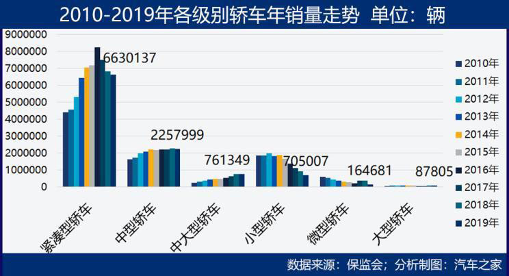 轎車占到國內(nèi)乘用車總體市場的一半,2019年銷售1061萬輛,同比減少5.59%,比整體車市跌的厲害一些,其中緊湊型轎車占到62%。如果看一下十年走勢,會(huì)發(fā)現(xiàn)一個(gè)非常明顯的趨勢是:緊湊型轎車的銷量從2017年開始逐年減少,小型轎車銷量的衰減在2014年就開始了,而中型轎車和中大型轎車的銷量卻在持續(xù)增加,中大型轎車是2019年轎車市場上唯一正增長的車型品類。隨著消費(fèi)結(jié)構(gòu)的升級(jí),轎車市場競爭的高級(jí)化趨勢開始顯現(xiàn)。