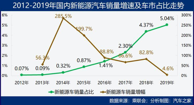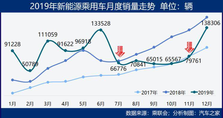 新能源汽車業(yè)結(jié)束了此前高歌上揚(yáng)的發(fā)展局面,2019年新能源汽車全年批發(fā)銷售106.4萬輛,較2018年僅增長4.64%。7月份,新的補(bǔ)貼周期開啟,當(dāng)月銷量首次同比下滑,打破新能源車月銷量多年保持連續(xù)同比增長的神話;之后四個(gè)月持續(xù)不振,11月份,銷量下行擊穿2017年11月的水平(80767輛),但12月的收官,終于為2019年挽回了一些顏面,達(dá)成了年銷百萬的水平。但新能源車市整體進(jìn)入低速增長期已是事實(shí),2020年新能源板塊將承受比燃油車更大的需求壓力。