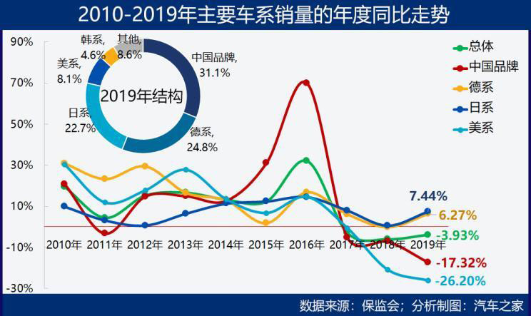 2019年,中國品牌汽車?yán)塾?jì)銷售675萬輛,德系車銷售537萬輛,日系車銷售492萬輛,美系車176萬輛,韓系車100萬輛。走勢看,中國品牌銷量較2018年減少17.32%,是近十年來的最大跌幅;美系車則自2016年開始在中國市場節(jié)節(jié)敗退,2019年的銷量跌幅進(jìn)一步加深,達(dá)26.2%。唯有日系車和德系車,在2019年逆勢而動(dòng),銷量分別同比增長7.44%和6.27%。