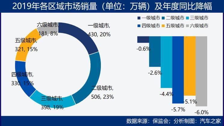 相對而言,一二級(jí)城市的首次汽車消費(fèi)達(dá)成比例已經(jīng)比較高了,未來增長將主要來自增購和換購。2019年,一級(jí)城市的汽車銷量同比降幅只有0.6%,是所有區(qū)域中降幅最低的,二級(jí)城市汽車銷量同比減少2.6%,也低于整體汽車市場的跌幅,揭示了經(jīng)濟(jì)水平與消費(fèi)水平的正相關(guān)。而三、四、五、六級(jí)城市的降幅都較整體市場為深,這類城市的汽車市場增長潛力主要來自首次新車購買,去年國家啟動(dòng)了“汽車下鄉(xiāng)”等激勵(lì)措施,從目前結(jié)果看,增量效應(yīng)并不明顯。