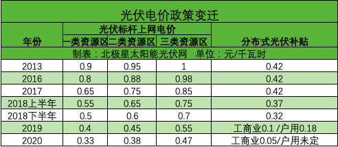 日前,2020年光伏電價(jià)政策征求意見(jiàn)稿出爐。三類資源區(qū)指導(dǎo)價(jià)每度降至0.33元、0.38元、0.47元,工商業(yè)分布式(自發(fā)自用、余電上網(wǎng))降至每度0.05元。
