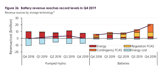 根據(jù)澳大利亞能源市場運(yùn)營商(AEMO)的調(diào)查,僅在2019年第四季度,澳大利亞正在運(yùn)營的五個(gè)電池儲能系統(tǒng)(其中包括 Hornsdale、Dalrymple North、Ballarat、Gannawarra和新建成的Bonney Lake)就獲得了2,000萬美元收入,與2018年第四季度相比增加了70%。