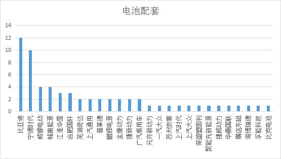 配套企業(yè)上,本批乘用車由28家電池企業(yè)提供配套,分別呈現(xiàn)兩極分化現(xiàn)象,有兩家企業(yè)配套數(shù)量超10款,另有13家企業(yè)配套車型僅1款。