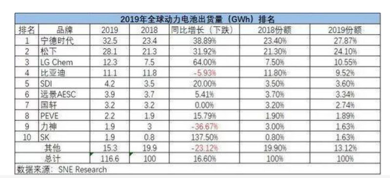 不久前,韓國SNE Research發(fā)布了2019年全球鋰離子動(dòng)力電池出貨量榜單,從整體數(shù)據(jù)來看,去年全球整體鋰離子動(dòng)力電池總出貨量為116.6GWh,同比增長16.6%,并且在前10名中,中國電池廠商占據(jù)了5個(gè)席位,相較2018年減少了2個(gè)。