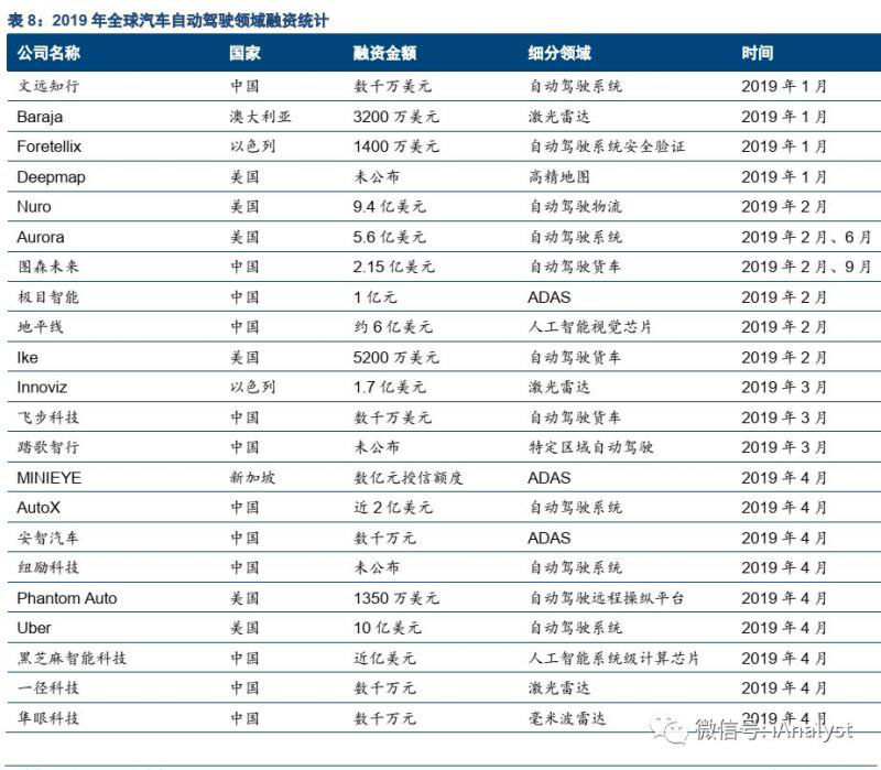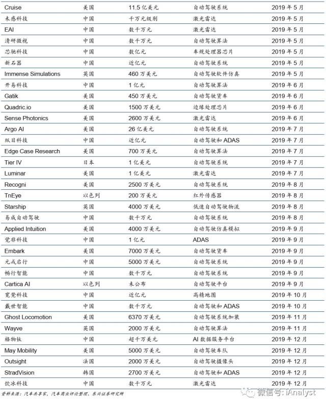 電動(dòng)化賦予新能源汽車生命,而智能化的自動(dòng)駕駛將為新能源汽車賦予更多附加值。實(shí)現(xiàn)自動(dòng)駕駛的新能源汽車將迎來(lái)類似于智能手機(jī)對(duì)傳統(tǒng)手機(jī)的替代的過(guò)程,由市場(chǎng)供給引導(dǎo)需求變化。而電動(dòng)汽車的整體結(jié)構(gòu)與系統(tǒng)設(shè)計(jì),更便于搭載自動(dòng)駕駛系統(tǒng)。從2019年全球范圍汽車自動(dòng)駕駛相關(guān)領(lǐng)域融資情況(如表8所示)來(lái)看,自動(dòng)駕駛領(lǐng)域的創(chuàng)業(yè)項(xiàng)目受到資本青睞,建議長(zhǎng)期關(guān)注這一領(lǐng)域的科技進(jìn)展與產(chǎn)業(yè)化落地。