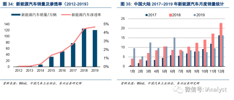 我國(guó)新能源汽車的購(gòu)置補(bǔ)貼從2009年開始,伴隨著人們對(duì)新能源汽車接受度的逐漸提升,以及充電樁等配套設(shè)施的完善,2014~2015年新能源汽車產(chǎn)銷出現(xiàn)了爆發(fā)式增長(zhǎng)。中國(guó)汽車工業(yè)協(xié)會(huì)數(shù)據(jù)表明,2014和2015年新能源汽車銷量分別為7.48萬(wàn)輛和33.11萬(wàn)輛,分別同比增長(zhǎng)3.24倍和3.43倍;2016~2018年銷量增速都維持在50%以上;2019年在新增車輛中的滲透率達(dá)到4.68%,如圖34所示。