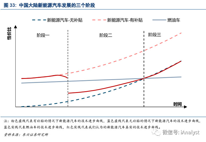 新能源汽車是相對(duì)于傳統(tǒng)燃油車而言的,其本質(zhì)是汽車驅(qū)動(dòng)力由化石燃料向電力的轉(zhuǎn)換。因?yàn)榛剂虾蛢?nèi)燃機(jī)作為交通工具主要的驅(qū)動(dòng)力已經(jīng)有一百多年歷史,其變革需要技術(shù)進(jìn)步、政策推動(dòng)、出行習(xí)慣改變等多方面共同努力,這就決定了新能源汽車替代傳統(tǒng)燃油車的進(jìn)程是一個(gè)漫長(zhǎng)的過(guò)程。我們認(rèn)為在傳統(tǒng)燃油車主導(dǎo)的時(shí)代,新能源汽車的發(fā)展或經(jīng)歷三個(gè)階段。如圖33所示。