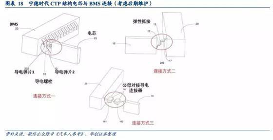 根據(jù)行業(yè)媒體披露的電池專利圖可以看到,寧德時代CTP結(jié)構(gòu)電池包中,電芯和電池管理系統(tǒng)連接結(jié)構(gòu),以及電芯與電池包殼體結(jié)構(gòu)(壓力和溫度傳感器放置)出現(xiàn)變化。此設(shè)計易于電池散熱處理,不采購模組結(jié)構(gòu)降低裝配難度提高生產(chǎn)效率,同時也便于電芯維護管理。