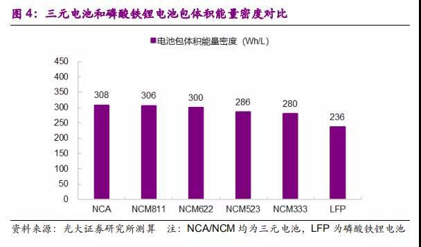 三元電池能量密度更高。當(dāng)前行業(yè)可以實現(xiàn)磷酸鐵鋰單體能量密度190Wh/kg,而三元電池可達(dá)250Wh/kg,因此三元電池被廣泛應(yīng)用于對續(xù)航里程要求更高的中高端乘用車領(lǐng)域。