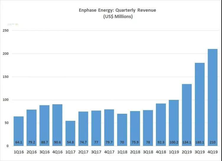 圖片:2016-2019年Enphase季度銷售額柱狀圖,2019年銷售額超過6.24億美元 來源:PV-Tech