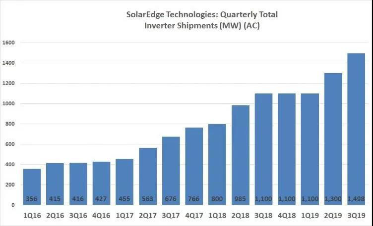圖片:2016-2019年Solaredge季度出貨量柱狀圖,全年出貨接近6GW 來源:PV-Tech
