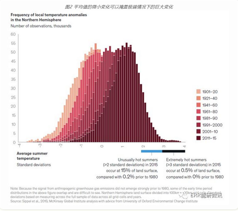 平均值掩蓋了極端情況下更為顯著的變化。在統(tǒng)計(jì)方面,溫度的分布正向右移動(dòng)(向暖化方向)并逐漸變寬。這意味著許多地方的平均日數(shù)現(xiàn)在更熱了(“變化的方式”),極熱的日數(shù)變得更可能(“肥尾巴”)。例如,北半球每100×100平方公里觀測(cè)到的夏季平均溫度分布的演變表明,夏季平均溫度隨著時(shí)間的推移而增加。北半球(以平方公里為單位)經(jīng)歷了一個(gè)相當(dāng)炎熱的夏天的百分比增加了15倍(從不足1%增至15%),即一年中平均氣溫升高兩個(gè)標(biāo)準(zhǔn)差。北半球(以平方公里為單位)經(jīng)歷了一個(gè)酷熱的夏天,在一個(gè)特定的夏天,三個(gè)標(biāo)準(zhǔn)差更熱的平均溫度所占的比例從零上升至0.5%。