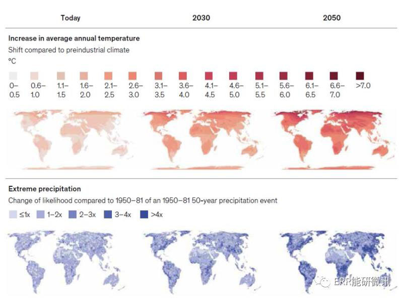 我們關(guān)注的是有形風(fēng)險(xiǎn),即氣候變化的有形影響所產(chǎn)生的風(fēng)險(xiǎn),包括對(duì)人、社區(qū)、自然和有形資本以及經(jīng)濟(jì)活動(dòng)的潛在影響,以及對(duì)公司、政府、金融機(jī)構(gòu)和個(gè)人的影響。物理風(fēng)險(xiǎn)是其他氣候風(fēng)險(xiǎn)類型(轉(zhuǎn)型風(fēng)險(xiǎn)和責(zé)任風(fēng)險(xiǎn))的基本驅(qū)動(dòng)力。我們不關(guān)注轉(zhuǎn)型風(fēng)險(xiǎn),即脫碳影響或與氣候變化相關(guān)的責(zé)任風(fēng)險(xiǎn)。雖然對(duì)脫碳及其帶來的風(fēng)險(xiǎn)和機(jī)遇的理解是一個(gè)關(guān)鍵的話題,但本報(bào)告通過探討在未脫碳的情況下,未來1~30年持續(xù)的氣候變化的性質(zhì)和代價(jià)做出了貢獻(xiàn)。