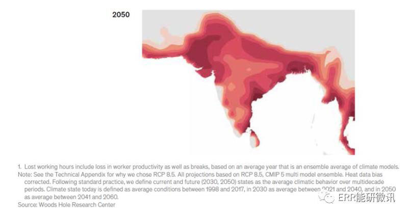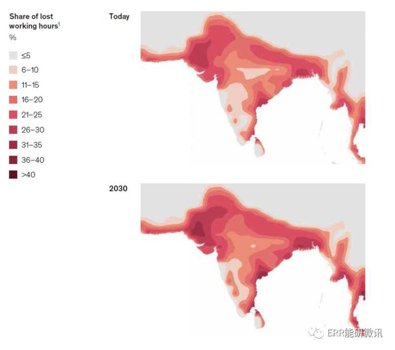 戶外勞動(dòng)生產(chǎn)率預(yù)計(jì)也會(huì)下降,從而減少可以在戶外工作的有效小時(shí)數(shù)。截至2017年,在印度,高溫作業(yè)產(chǎn)生了約50%的GDP,推動(dòng)了約30%的GDP增長,雇傭了約75%的勞動(dòng)力,約3.8億人。到2030年,根據(jù)我們的估計(jì),印度的平均白天工作時(shí)間損失可能會(huì)增加到每年占GDP的2.5~4.5%之間。