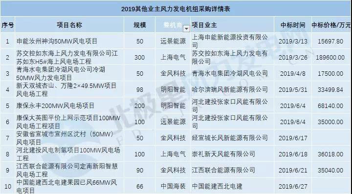 其中,金風(fēng)科技中標(biāo)6個(gè)風(fēng)電項(xiàng)目,中標(biāo)項(xiàng)目規(guī)模615MW,中標(biāo)金額為263115.98萬元;遠(yuǎn)景能源中標(biāo)10個(gè)風(fēng)電項(xiàng)目,中標(biāo)項(xiàng)目規(guī)模706.9MW,中標(biāo)金額為260706.85萬元;明陽智能中標(biāo)4個(gè)風(fēng)電項(xiàng)目,中標(biāo)項(xiàng)目規(guī)模462.6MW,中標(biāo)金額為125939.84萬元;上海電氣中標(biāo)5個(gè)風(fēng)電項(xiàng)目,中標(biāo)項(xiàng)目規(guī)模749.5MW,中標(biāo)金額為667981.5萬元;中國(guó)海裝中標(biāo)4個(gè)風(fēng)電項(xiàng)目,中標(biāo)項(xiàng)目規(guī)模516MW,中標(biāo)金額為166375萬元;湘電風(fēng)能中標(biāo)4個(gè)風(fēng)電項(xiàng)目,中標(biāo)項(xiàng)目規(guī)模235MW,中標(biāo)金額為107432萬元;中車株洲所中標(biāo)1個(gè)風(fēng)電項(xiàng)目,中標(biāo)項(xiàng)目規(guī)模15MW,中標(biāo)金額為6106.625萬元;維斯塔斯中標(biāo)1個(gè)風(fēng)電項(xiàng)目,中標(biāo)項(xiàng)目規(guī)模200MW,中標(biāo)金額為79652.16萬元;東方風(fēng)電中標(biāo)1個(gè)風(fēng)電項(xiàng)目,中標(biāo)項(xiàng)目規(guī)模50MW;運(yùn)達(dá)風(fēng)電中標(biāo)3個(gè)風(fēng)電項(xiàng)目,中標(biāo)項(xiàng)目規(guī)模280MW,中標(biāo)金額為98000萬元;GE中標(biāo)3個(gè)風(fēng)電項(xiàng)目,中標(biāo)項(xiàng)目規(guī)模100MW,中標(biāo)金額為34914.5萬元;山東中車中標(biāo)個(gè)風(fēng)電項(xiàng)目,中標(biāo)項(xiàng)目規(guī)模100MW,中標(biāo)金額為37406.26萬元。以下為其他風(fēng)電業(yè)主部分項(xiàng)目采購情況表。