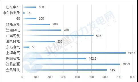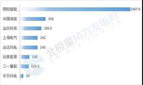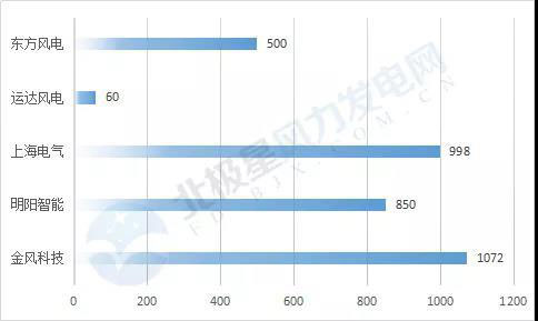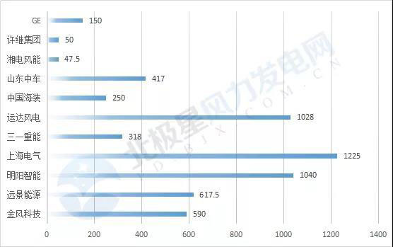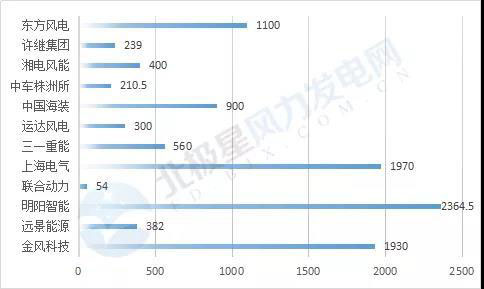 其中,金風(fēng)科技中標(biāo)3個(gè)風(fēng)電項(xiàng)目,中標(biāo)項(xiàng)目規(guī)模590MW,中標(biāo)總訂單金額為413442.67 萬元;遠(yuǎn)景能源中標(biāo)7個(gè)風(fēng)電項(xiàng)目,中標(biāo)項(xiàng)目規(guī)模617.5MW,中標(biāo)總訂單金額為277612.20 萬元;明陽智能中標(biāo)6個(gè)風(fēng)電項(xiàng)目,中標(biāo)項(xiàng)目規(guī)模1040MW,中標(biāo)總訂單金額為520262.61 萬元;上海電氣中標(biāo)4個(gè)風(fēng)電項(xiàng)目,中標(biāo)項(xiàng)目規(guī)模1225MW,中標(biāo)總訂單金額為782653.14 萬元;運(yùn)達(dá)風(fēng)電中標(biāo)7個(gè)風(fēng)電項(xiàng)目,中標(biāo)項(xiàng)目規(guī)模1028MW,中標(biāo)總訂單金額為404246.01 萬元;中國(guó)海裝中標(biāo)5個(gè)風(fēng)電項(xiàng)目,中標(biāo)項(xiàng)目規(guī)模250MW,中標(biāo)總訂單金額為132226.53 萬元;三一重能中標(biāo)7個(gè)風(fēng)電項(xiàng)目,中標(biāo)項(xiàng)目規(guī)模318MW,中標(biāo)總訂單金額為141240.00萬元;山東中車中標(biāo)5個(gè)風(fēng)電項(xiàng)目,中標(biāo)項(xiàng)目規(guī)模417MW,中標(biāo)總訂單金額為195690.66萬元;許繼風(fēng)電中標(biāo)1個(gè)風(fēng)電項(xiàng)目,中標(biāo)項(xiàng)目規(guī)模50MW,中標(biāo)總訂單金額為23679.13 萬元;湘電風(fēng)能中標(biāo)47.5個(gè)風(fēng)電項(xiàng)目,中標(biāo)項(xiàng)目規(guī)模18920.56 MW,中標(biāo)總訂單金額為195690.66萬元;GE中標(biāo)1個(gè)風(fēng)電項(xiàng)目,中標(biāo)項(xiàng)目規(guī)模150MW,中標(biāo)總訂單金額為60763.40 萬元;
