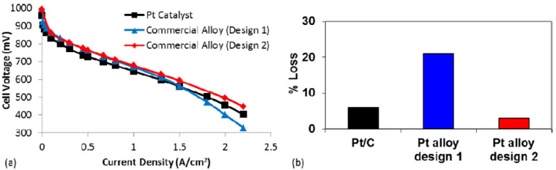 a)兩種催化層設(shè)計下商用Pt/C和Pt合金催化劑的極化曲線;b)每種催化層設(shè)計在5000次0.6-1.0 V電壓循環(huán)后的性能損失