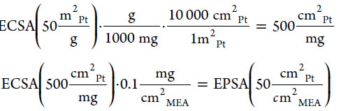 通用汽車公司2016年發(fā)表的一篇文章中對此進(jìn)行了重要討論,證明了EPSA對氧氣傳輸損失現(xiàn)象的至關(guān)重要性,并突出了開發(fā)高電化學(xué)活性面積催化劑的重要性,如上圖所示。具體來說,EPSA是鉑族金屬催化劑擔(dān)載量(mg PGM/cm2 MEA)和ECSA(m2/g)的乘積。鉑族金屬催化劑擔(dān)載量是美國能源部在成本要求下提出的2020年鉑族金屬催化劑擔(dān)載量目標(biāo)值0.125 mg/cm2。通用汽車公司在研究中設(shè)定陽極擔(dān)載量為0.025 mg/cm2(可實現(xiàn)的最低擔(dān)載量,在不損失氫氧化動力學(xué)性能前提下),陰極鉑族金屬催化劑擔(dān)載量則只能為0.1 mg/cm2。在此目標(biāo)擔(dān)載量下,上圖中的x軸可以直接轉(zhuǎn)換為催化劑電化學(xué)活性面積。以下公式給出了一個示例,假設(shè)催化劑目標(biāo)擔(dān)載量為0.1 mg/cm2時電化學(xué)活性面積為50 m2/g。