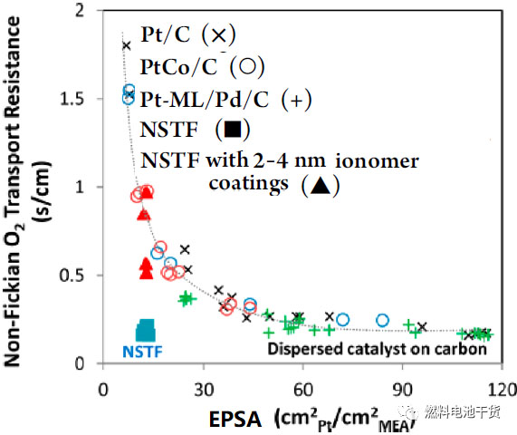 盡管目前電化學(xué)活性面積這一參數(shù)尚未在美國能源部的燃料電池電催化劑技術(shù)目標(biāo)里出現(xiàn),但顯然如果要實現(xiàn)<0.1 mg PGM/cm2的陰極催化劑擔(dān)載量目標(biāo),電化學(xué)活性面積也是一個關(guān)鍵參數(shù)。具體來說,目前已廣泛報道,當(dāng)EPSA(實際鉑表面積/MEA幾何表面積)達(dá)到<?50 cm2 Pt/cm2 MEA時,電流密度>1.5 A/cm2下觀察到的性能損失超過傳統(tǒng)的巴特勒-沃爾默動力學(xué)所預(yù)測的損失,這種額外的性能損失是氧氣通過覆蓋催化劑表面的聚合物膜時傳輸阻力引起的。隨著EPSA降低,每個催化劑顆粒上的局部氧氣通量會大大增加,導(dǎo)致傳輸阻力的局部升高。