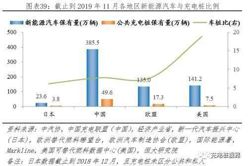 截止到2019年11月,據(jù)中汽協(xié)、中國充電聯(lián)盟統(tǒng)計,中國新能源汽車、公共充電樁保有量分別為385.5萬輛、49.6萬個,對應(yīng)車樁比7.77:1;據(jù)ACEA、歐盟替代燃料瞭望臺統(tǒng)計,歐盟新能源汽車、公共充電樁保有量分別為135.0萬輛、17.3萬個,對應(yīng)車樁比7.78:1;據(jù)Markline、美國可替代燃料數(shù)據(jù)中心統(tǒng)計,美國新能源汽車、公共充電樁保有量分別為141.2萬輛、7.5萬個,對應(yīng)車樁比18.88:1。截止到2018年12月,據(jù)日本經(jīng)濟產(chǎn)業(yè)省披露,日本新能源汽車保有量23.6萬輛;據(jù)新一代汽車振興中心披露,充電樁保有量3.8萬個,對應(yīng)車樁比6.15:1。