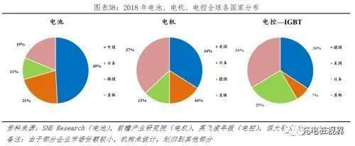 電池、電機、電控是新能源汽車核心技術(shù)。1)電池:據(jù)SNE Research披露,2018年全球TOP10企業(yè)動力電池裝機量,CATL、松下、比亞迪、LG化學、AESC、三星SDI、Farasis、國軒、力神、億緯分別為:21.3、20.7、11.6、7.4、3.7、3.0、3.3、3.2、2.8、1.9GWh;其中中國、日本、韓國分別占比49.2%、21.4%、10.7%,合計81.3%。2)電機:據(jù)前瞻產(chǎn)業(yè)研究院披露,2018年全球新能源汽車電機市場,美國、日本、德國分別占比34%、16%、13%;其中中國新能源汽車車用電機基本實現(xiàn)國產(chǎn)替代。3)電控IGBT:IGBT作為新能源汽車電控系統(tǒng)核心零部件,據(jù)英飛凌年報披露,2018年全球IGBT領(lǐng)域,英飛凌、三菱、富士電機、安森美、賽美控分別占比28.6%、15.2%、9.7%、7.2%、5.7%;按國籍分,德國34.3%、美國7.2%、日本24.9%;2018年我國IGBT領(lǐng)域進口依存度約 90%。