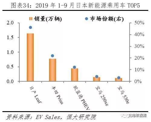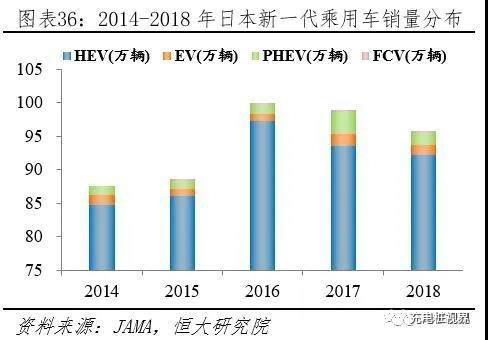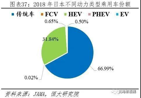 日本新一代汽車HEV占據(jù)統(tǒng)治地位。日本由于發(fā)動機技術(shù)領(lǐng)先,發(fā)展HEV有天然優(yōu)勢,故將HEV納入新一代汽車體系,與EV和PHEV共同發(fā)展。據(jù)日本汽車銷售聯(lián)合會(JAMA)披露,2018年日本乘用車新車HEV、EV、PHEV、FCV、傳統(tǒng)車銷量分別為92.18、1.46、1.88、0.06、193.97萬輛,分別占比66.99%、31.84%、0.65%、0.50%、0.02%。
