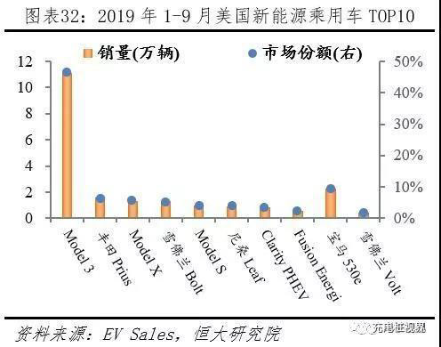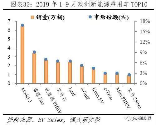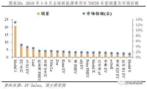 TOP20車型中國占有9席、歐盟占據(jù)5席、特斯拉全系上榜、Model 3一枝獨秀。據(jù)EV Sales統(tǒng)計,2019年1-9月全球新能源乘用車TOP20車型銷量從高到低依次為:Model 3、EU系列、元/S2 EV、Leaf、歐藍德 PHEV、寶駿 E系列、530e/Le、Zoe、Kona EV、寶馬i3、唐 PHEV、eQ EV、PriusPHEV、Model X、比亞迪e5、帝豪 EV、e-Golf、榮威 Ei5 EV、歐拉 R1 EV、Model S;對應(yīng)銷量20.80、7.43、6.08、5.38、3.86、3.73、3.68、3.52、3.30、3.06、3.00、2.96、2.87、2.86、2.84、2.73、2.54、2.35、2.26、2.05萬輛;其中中國9款,美國3款,日本2款,歐盟5款,韓國1款。