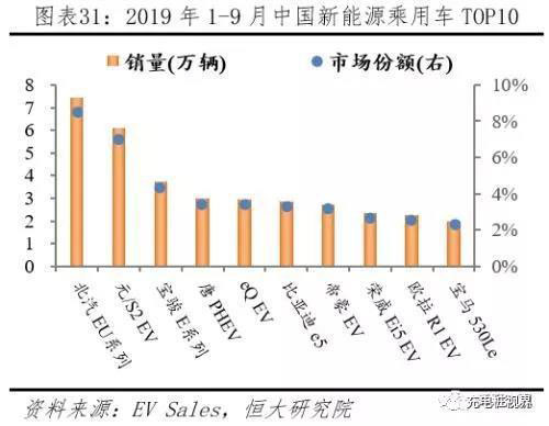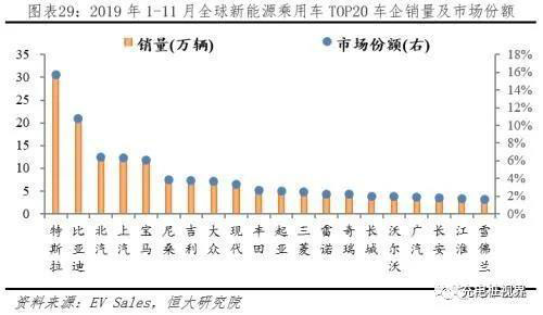 特斯拉、比亞迪市占率均超過10%,北汽、上汽、寶馬市占率均超過5%。據(jù)EV Sales披露,2019年1-11月全球新能源乘用車TOP20車企銷量從高到低依次為:特斯拉、比亞迪、北汽、上汽、寶馬、尼桑、吉利、大眾、現(xiàn)代、豐田、起亞、三菱、雷諾、奇瑞、長城、沃爾沃、廣汽、長安、江淮和雪佛蘭,其中中國10家、美國2家、日本3家、歐盟3家、韓國2家;TOP20對應(yīng)銷量為中國75.51萬、美國33.65萬、日本17.50萬、歐盟23.26萬、韓國11.65萬輛;TOP20對應(yīng)市占率為中國38.88%、美國17.32%、日本9.01%、歐盟11.97%、韓國5.96%。