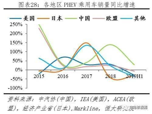 2019H1全球市場PHEV增速下滑,歐美EV、PHEV增速分化嚴重。2019H1新能源乘用車市場,據(jù)中汽協(xié)披露,中國EV、PHEV同比增速分別為69.9%、28.0%;據(jù)ACEA披露,歐盟EV、PHEV同比增速90.9%、-6.9%;據(jù)Markline披露,日本EV、PHEV同比增速-27.7%、-31.1%,美國EV、PHEV同比增速68.0%、-29.5%,其它地區(qū)EV、PHEV同比增速52.7%、-37.6%。按照上述統(tǒng)計,2019H1全球新能源乘用車市場,EV、PHEV同比增速分別為68.7%、-0.8%。
