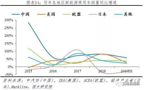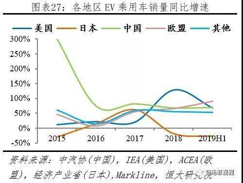 歐盟增速持穩(wěn),中、美增速下滑,日本持續(xù)負增長。據(jù)中汽協(xié)、IEA、ACEA等機構(gòu)統(tǒng)計,2018年中國、美國、歐盟、日本、其它地區(qū)同比增速分別為81.9%、82.2%、42.2%、-34.4%、40.6%;2019H1中國、美國、歐盟、日本、其它地區(qū)同比增速分別為58.6%、27.9%、37.9%、-29.1%、23.1%。