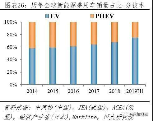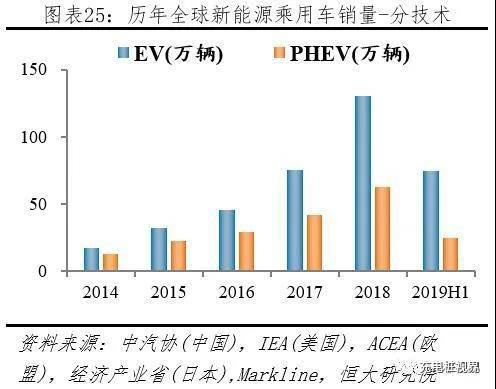 2019H1全球新能源乘用車市場EV占比3/4,份額持續(xù)提升。2019H1新能源乘用車市場,據(jù)中汽協(xié)披露,中國EV、PHEV分別銷售44.0、12.3萬輛;據(jù)ACEA披露,歐盟EV、PHEV分別銷售12.5、7.2萬輛;據(jù)Markline披露,美國EV、PHEV分別銷售10.6、3.1萬輛,日本EV、PHEV分別銷售1.1、0.7萬輛,其它地區(qū)EV、PHEV分別銷售6.2、1.2萬輛。按上述統(tǒng)計,2019H1全球新能源乘用車市場,EV、PHEV分別銷售74.4、24.6萬輛;EV市場份額從2014年58.4%提升到2019上半年75.2%。