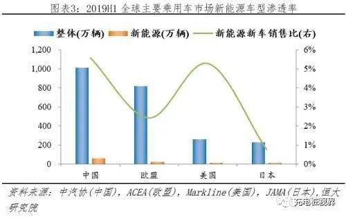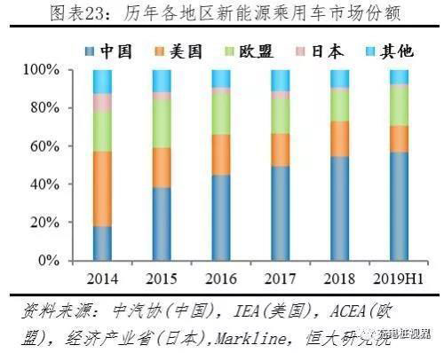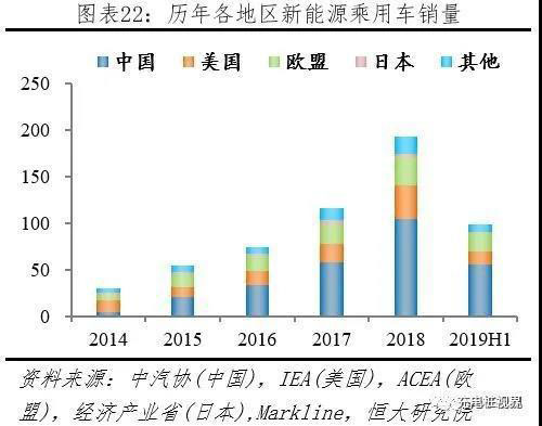 2019H1新能源乘用車全球份額,中國五成、歐盟兩成、美日共兩成。據(jù)中汽協(xié)披露,2018、2019H1中國新能源乘用車分別銷售105.3、56.3萬輛;據(jù)IEA、Markline披露,2018、2019H1美國新能源乘用車分別銷售36.1、13.7萬輛;據(jù)ACEA披露,2018、2019H1歐盟新能源乘用車分別銷售30.2、19.8萬輛;據(jù)經(jīng)濟產(chǎn)業(yè)省、Markline披露,2018、2019H1日本新能源乘用車分別銷售18.4、7.4萬輛;據(jù)IEA、Markline披露,2018、2019H1其它地區(qū)新能源乘用車分別銷售18.4、7.4萬輛。按照上述統(tǒng)計, 2019H1中國、美國、歐盟、日本、其它地區(qū)新能源乘用車市場份額分別為56.9%、13.8%、20.0%、1.8%、7.5%。