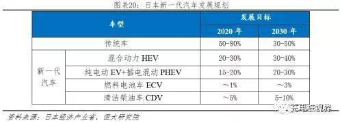 2020年、2030年新能源汽車分別占比15-20%、20-30%。2010年4月日本經(jīng)濟產(chǎn)業(yè)省發(fā)布《下一代汽車戰(zhàn)略2010》,將下一代汽車定義為:非插電式混合動力汽車(HEV)、純電動汽車(BEV)、插電式混合動力汽車(PHEV)、燃料電池汽車(FCV)、清潔柴油汽車(CDV)等。并首次公告發(fā)展目標:到2020年,下一代汽車將在新車銷量中力爭達到20%~50%;到2030年,下一代汽車將在新車銷量中力爭達到50%~70%,并沿用至今。
