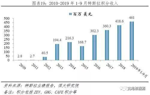 據(jù)特斯拉披露,2010-2019Q3特斯拉累計積分銷售收入21.68億美元,其中2016、2017、2018年,ZEV和非ZEV積分收入分別為2.15、0.87,2.80、0.81,1.03、3.15億美元。
