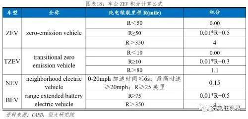 (2)ZEV積分公式:CARB根據(jù)下表所示積分公式計算各企業(yè)ZEV積分,并進行年度公示。根據(jù)《Health and Safety Codesection 43211 civil penalty》條例,對于不滿足ZEV積分要求的公司,每個ZEV積分罰款5000美元。