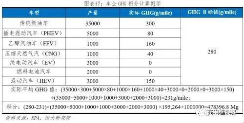 GHG標準采用積分制管理。EPA每年發(fā)布年度各車企GHG報告,對各車企積分進行公示,產(chǎn)生負積分的企業(yè)需要購買GHG正積分進行沖抵。GHG積分=(GHG目標值-GHG實際值)×產(chǎn)量×全生命周期里程÷1000000。其中全生命周期里程:乘用車為195264英里;積分單位:Mg(megagrams兆克)。假設(shè):車企A年產(chǎn)50000輛乘用車,各車型產(chǎn)量分布如下,則計算可得該年實際積分為:478396.8Mg。