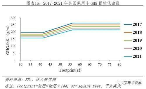 1)CAFE和GHG標準:2010年5月,奧巴馬要求美國環(huán)保署(EPA)和美國公路安全管理局(NHTSA)根據(jù)《Clean Air Act》和《Energy Independence and Security Act of 2007》推行國家級2017-2025年輕型車項目,以提升CAFE和降低GHG排放。其中,EPA負責制定2017-2025年GHG標準,NHTSA負責制定2017-2025年CAFE標準。GHG政策第一階段“2017-2021”標準已頒布,第二階段“2022-2025”標準,因2018年4月2號,特朗普政府指責過于嚴苛,影響就業(yè),需重新修改,新版本暫未公布。CAFE政策第一階段“2017-2021”標準已頒布,第二階段“2022-2025”標準中期評估中,暫未公布。CAFE與GHG相似處頗多:1)皆采用積分制,GHG排放低于目標值可獲得正積分,反之負積分;2)其標準值皆是分車型、參考汽車占地面積“Footprint”為參考。以GHG標準為例,其2017-2021年乘用車目標值曲線如下,對于不滿足GHG標準的車企,根據(jù)《Clean Air Act》第205條款,最高可單車罰款37500美元。
