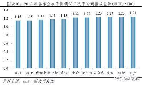 3)測試標準更嚴:2021年開始執(zhí)行WLTP測試標準,相比NEDC測試標準而言,WLTP測試標準測試距離長、周期多、速度快,更接近實際。根EEA發(fā)布的2018年歐盟乘用車測試數(shù)據(jù)顯示,WLTP標準下乘用車碳排放相比NEDC平均高出21%左右,主流車企測試結(jié)果顯示高出15%-24%。