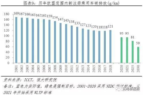 1)目標值降幅大:2021年開始采用新測試標準WLTP,乘用車排放不得高于95g/km,2025年、2030年分別在2021年基礎(chǔ)上減少15%、37.5%。據(jù)國際清潔交通委員會(ICCT)披露,歐盟乘用車企實際碳排放從2001年169g/km下降到2018年121g/km,年均降幅僅1.9%。