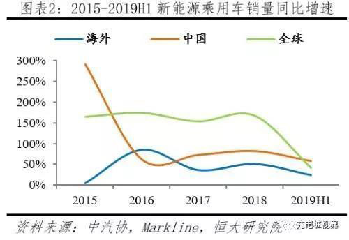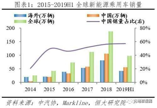 2019上半年中國新能源乘用車市場份額過半,增速遠超海外。據(jù)中汽協(xié)統(tǒng)計,2019H1國內(nèi)新能源乘用車(EV+PHEV)銷售56.29萬輛,同比增長57.75%。據(jù)Markline統(tǒng)計,2019H1海外新能源乘用車銷售42.13萬輛,同比增長24.50%。2019H1全球新能源乘用車合計銷售98.42萬輛,中國占比57.19%,超過一半,增速較國外高33.25個百分點。
