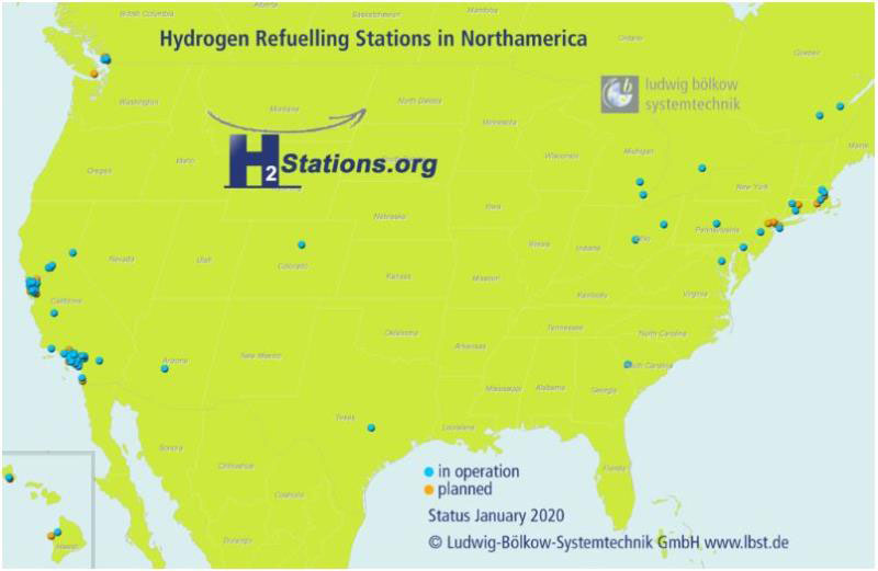 北美地區(qū)方面,H2stations數(shù)據(jù)顯示,截止2019年底加氫站數(shù)量達到74個,其中大多數(shù)仍位于加州(48個)。2019年北美地區(qū)增加了四個新的加氫站,在未來還將新建立21個新的加氫站。